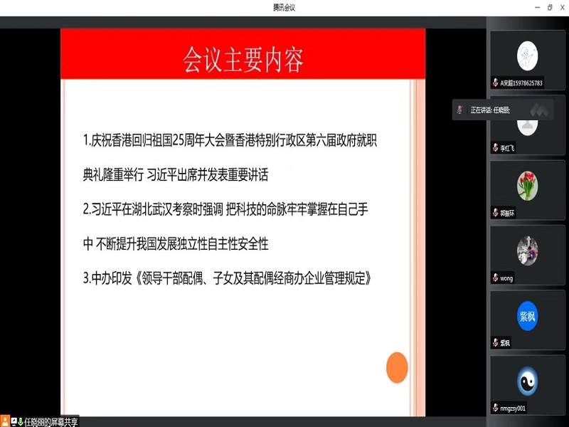 此次主题党日活动各党支部首先集中学习了习近平总书记在庆祝香港回归祖国25周年大会暨香港特别行政区第六届政府就职典礼上发表的重要讲话。会上,教工第四党支部党员汪洋同志表示,要深入领会习近平总书记重要讲话的丰富内涵、精神实质、实践要求,坚决按照总书记指引的方向走好新的赶考之路;要牢牢扛起疫情防控这个首要政治任务,抓紧抓实抓细抓严疫情防控的“四个责任”;要强化底线意识,以“时时放心不下”的责任感做好员工工作,以实际行动迎接党的二十大胜利召开。随后,各个党支部领学了习近平总书记在湖北武汉考察时重要讲话精神,以及《领导干部配偶、子女及其配偶经商办企业管理规定》。