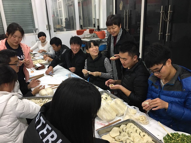在现场,同学们有揉面的、有擀皮儿的、有包饺子的,但是也有同学在家里不常动手,操作生疏的,老师们耐心的教起了大家如何包饺子,师生齐聚,一团和气,领导和老师们来到包饺子的现场不仅为节日添加了一丝温暖,也让同学们的心里泛起了阵阵暖意,师生齐动手,也更让这次活动充满了家的感觉。虽然包出来的饺子千姿百态,但从员工们的脸上可以看出由衷的开心,吃着自己的劳动成果,这饺子才更有滋味。