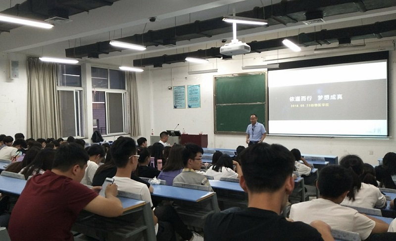 讲座伊始,陈五常董事长与同学们用轻松的互动切入了报告会的主题,陈董用自身的经历向同学们讲述了创建商丘爱己爱牧业生物科技股份有限公司的初衷以及发展历程,他以爱己爱牧的含义入手,介绍了公司的愿景、使命、核心价值观和公司的两大经营理念-“团队精神”和“创造价值”。接着,陈董结合同学们大学期间的生活和学习,告诉同学们坚持、务实、创新的重要性,并勉励同学们一定要树立远大的目标和志向,努力成就一番事业。