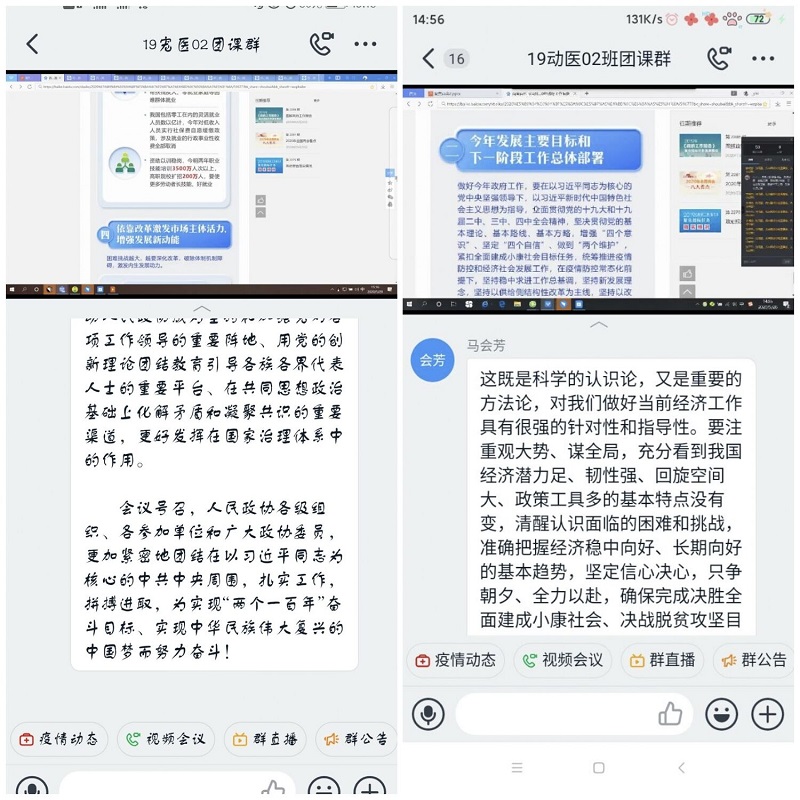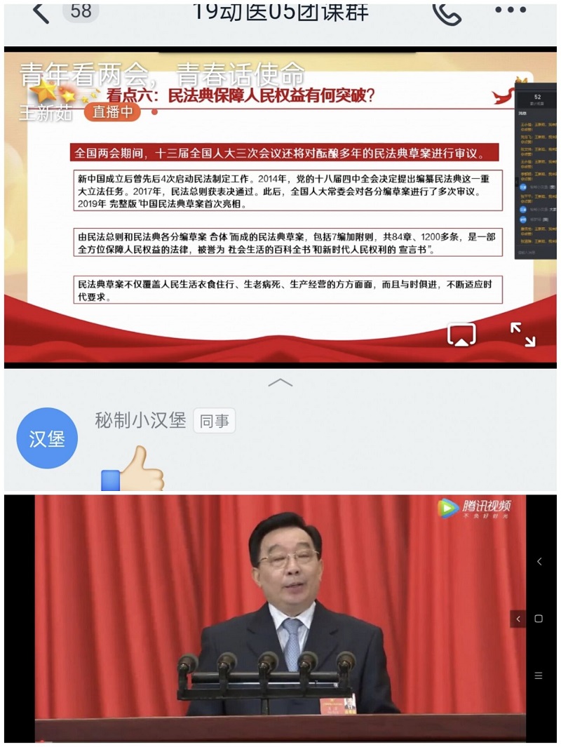 本次团课以班级为单位以直播的形式进行,由各班团支书带领向同学了解两会的内容要点,首先是“两会”是在怎样的背景条件下召开的,其次带领同学们了解在当前国内外严峻的经济形势下,食品安全问题、住房问题、上学、看病、就业、以及养老等一系列民生问题,越来越成为代表委员关心的话题。团课后期由同学们自由讨论交流关于两会内容和精神的感想和心得,并提出自己的看法。同学们各抒己见,畅所欲言,团课气氛严肃且热烈。直至团课结束有许多同学仍沉浸其中,意犹未尽。同学们表示身为当代老员工,我们应与时代同步,倾听“两会”的声音。国家政策关乎十几亿民生民计,关乎我们每个人的切身利益。身为广大青年中的一员,我们应当站在时代的前沿,了解社会热点,结合自身发展实现远大理想抱负。