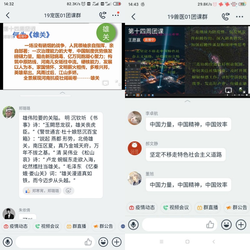 本周团课各班均采用直播的形式开展。首先,各班主持人带领同学们观看《雄关》,并提出一系列问题,引导团员青年把学习观看《雄关》与深入学习贯彻新冠肺炎疫情发生以来习近平总书记发表的重要讲话结合起来。同学们针对主持人提出的问题激烈讨论,纷纷表示,作为优秀团员青年的我们一定要坚定信念,在这场新冠病毒肺炎疫情中,加油呐喊,众志一心,以平凡的点滴力量坚守后方。通过观看《雄关》,同学们看到在这场抗疫战争中,河南坚决听从习近平总书记号令,凝心聚力、众志成城,动员一切可以动员的力量构筑一道坚不可摧的“中原防线”,调集一切可以调集的资源为全国疫情防控贡献“河南力量”。同时,同学们也感受到了在党的领导下打赢疫情防控阻击战的制度优势,见证了危难时刻挺身而出的中国精神。疫情仍未结束,我们仍须慎终如始,不忘初心、牢记使命,发扬不畏艰险、无私奉献的精神。