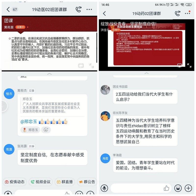 本周团课各团支部均采用直播的形式开展。首先,为提高同学们对于中国特色社会主义制度的了解,各班团课主持人与同学们共同学习交流了中国特色社会主义制度的理论综述及其内涵价值。随后,了解到了祖国对这次抗疫的决心与努力,在此期间,一个个世界奇迹在中国诞生。火神山,雷神山的建立正是在中国特色社会主义制度的优越前提下被完成的。最后,学习了无数无名抗疫英雄的伟大精神,让我们知道总有人逆风前行保山川清平,总有人牺牲自己保全他人。君可见,钟南山院士耄耋之年临危受命,国士无双;君可见,白衣战士纷纷请战驰援前线,上演最美“逆行”;君可见,爱心人士身体力行,满腔热血;君可见,众多国家分分援助物资,攻克难关……