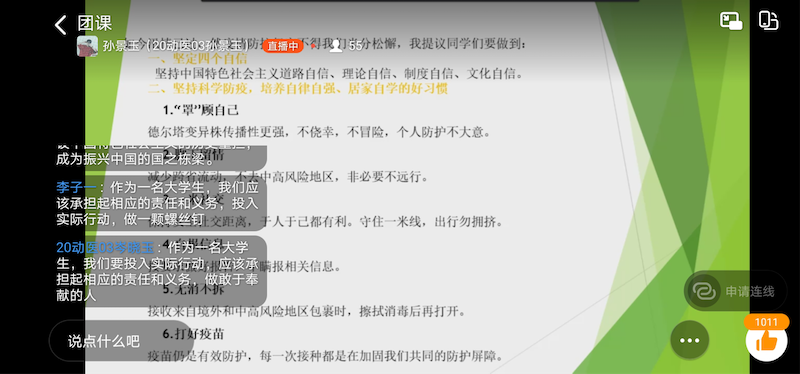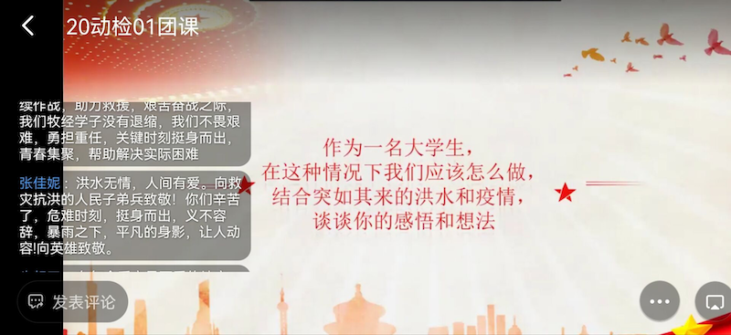 本次团课顺利进行,同学们积极参与,并且表示通过本次团课进一步激励和引导广老员工“把灾难当教材,与祖国共成长”的意识,进一步坚定“四个自信”,坚持科学防疫,培养自律自强、居家自学的良好习惯,积极参与当地志愿服务,用实际行动筑起疫情防控的“青春长城”。(文/图关兵峰)