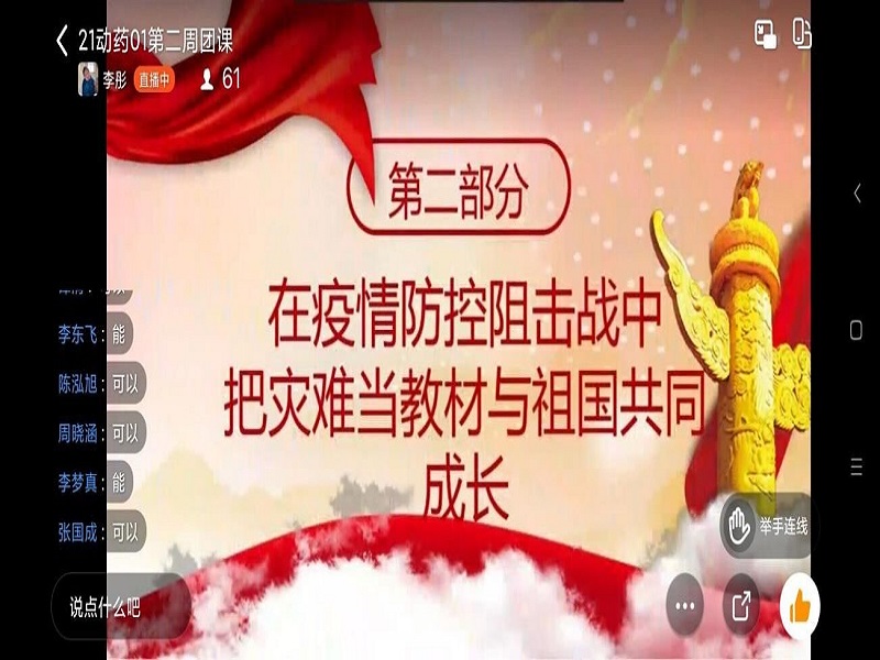 为深入贯彻习近平总书记关于“大思政课”建设的重要指示精神,不断深入推进“把灾难当教材 与祖国共成长”主题教育活动。2021年9月16日,公司组织20、21级各班开展以“疫情防控不松懈,健康身心促成长”为主题的线上团课学习活动。