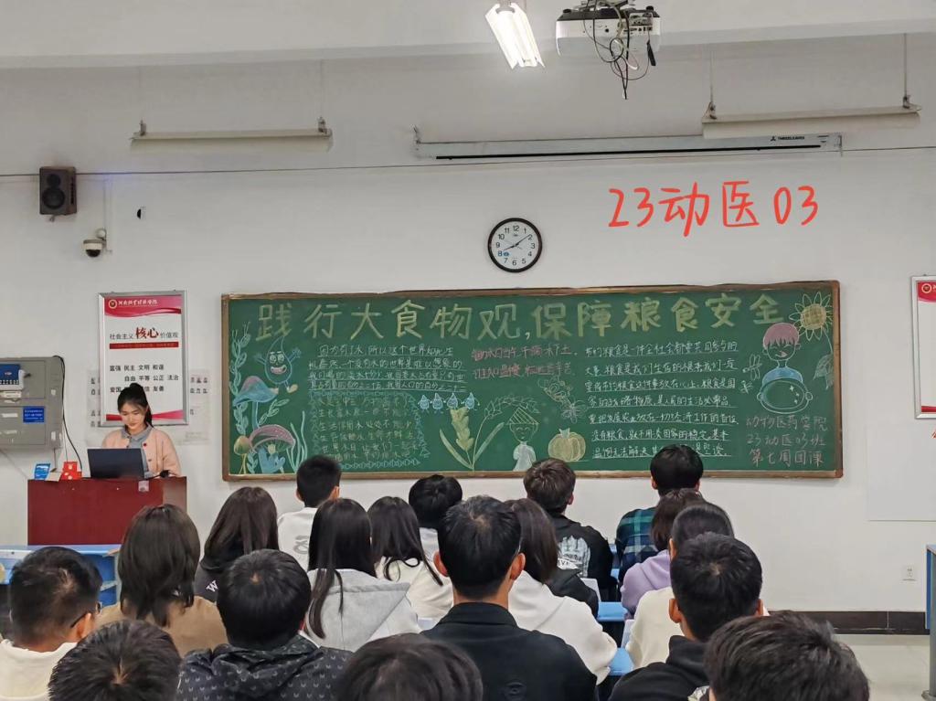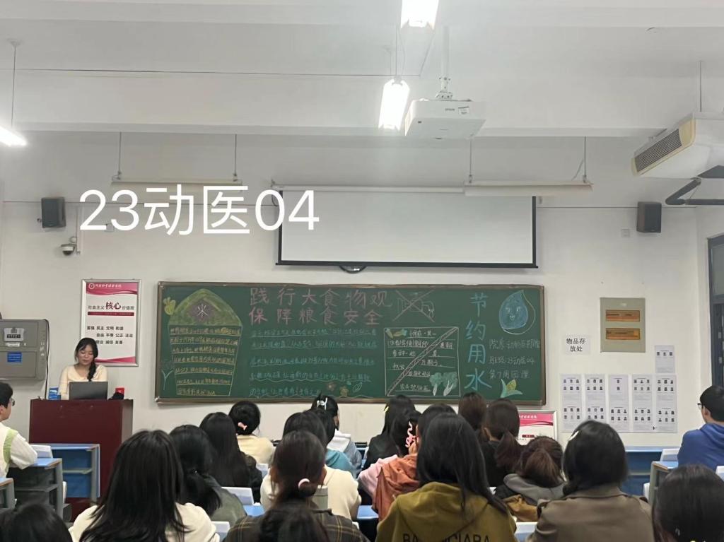 团课伊始,主持人通过ppt介绍了今年世界粮食日和世界粮食安全宣传周的主题,世界粮食日主题为“水是生命之源,水是粮食之本,不让任何人掉队”,粮食安全宣传周主题是“践行大食物观 保障粮食安全”。在讲解中,“不让任何人掉队”的主题掷地有声,引发同学共鸣。随后,通过播放粮食生产过程的纪录片,展示了粮食的来之不易,让同学们深刻认识到粮食安全对于全球人民的重要性。正如人民日报所言:“国以民为本,民以食为天”。在团课的最后,主持人提出倡议:自觉从自身做起、从小事做起,离开教室及时关闭设备和照明,尽量集中教室进行自习,爱惜粮食、杜绝浪费。争做勤俭美德的倡导者、争做制止浪费的示范者、争做爱粮节粮的践行者、争做厉行节约的宣传者。