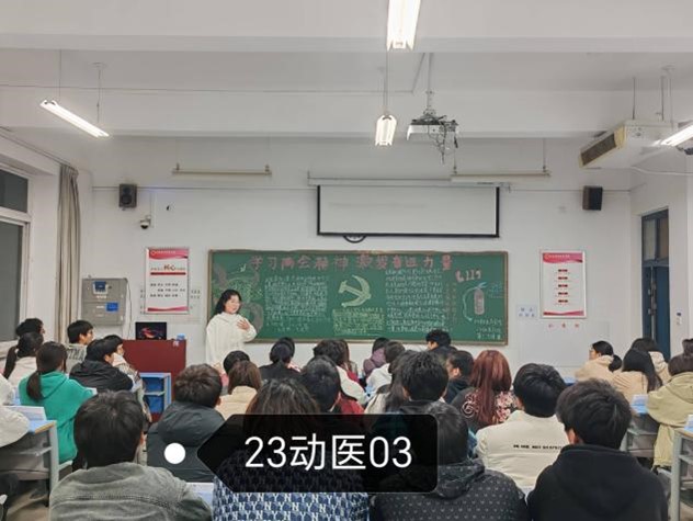 团课伊始,主持人以播放视频的方式带领各班员工认真回顾了两会的焦点内容,带领同学们再次回到2024年两会现场,身临其境领悟习近平同志的讲话核心。接着,主持人针对两会的召开时间、会议议程展开详述,全面地讲解了两会的各项事宜,也将“新质生产力”“新三样”“人工智能”等两会热词带入同学们眼中。随后,主持人鼓励同学们围绕两会热点话题,结合自身踊跃发言。23动药01的黄炎表示,我们在努力学习的同时应该关注国家政治、社会发展,积极参与社会实践,为国家建设贡献自己的力量。最后,主持人从2024年社会热点出发,强调两会不仅擘画了国家未来发展的宏伟蓝图,更明确了我们青年一代的时代重任和历史使命,要将“两会”精神融入平常。