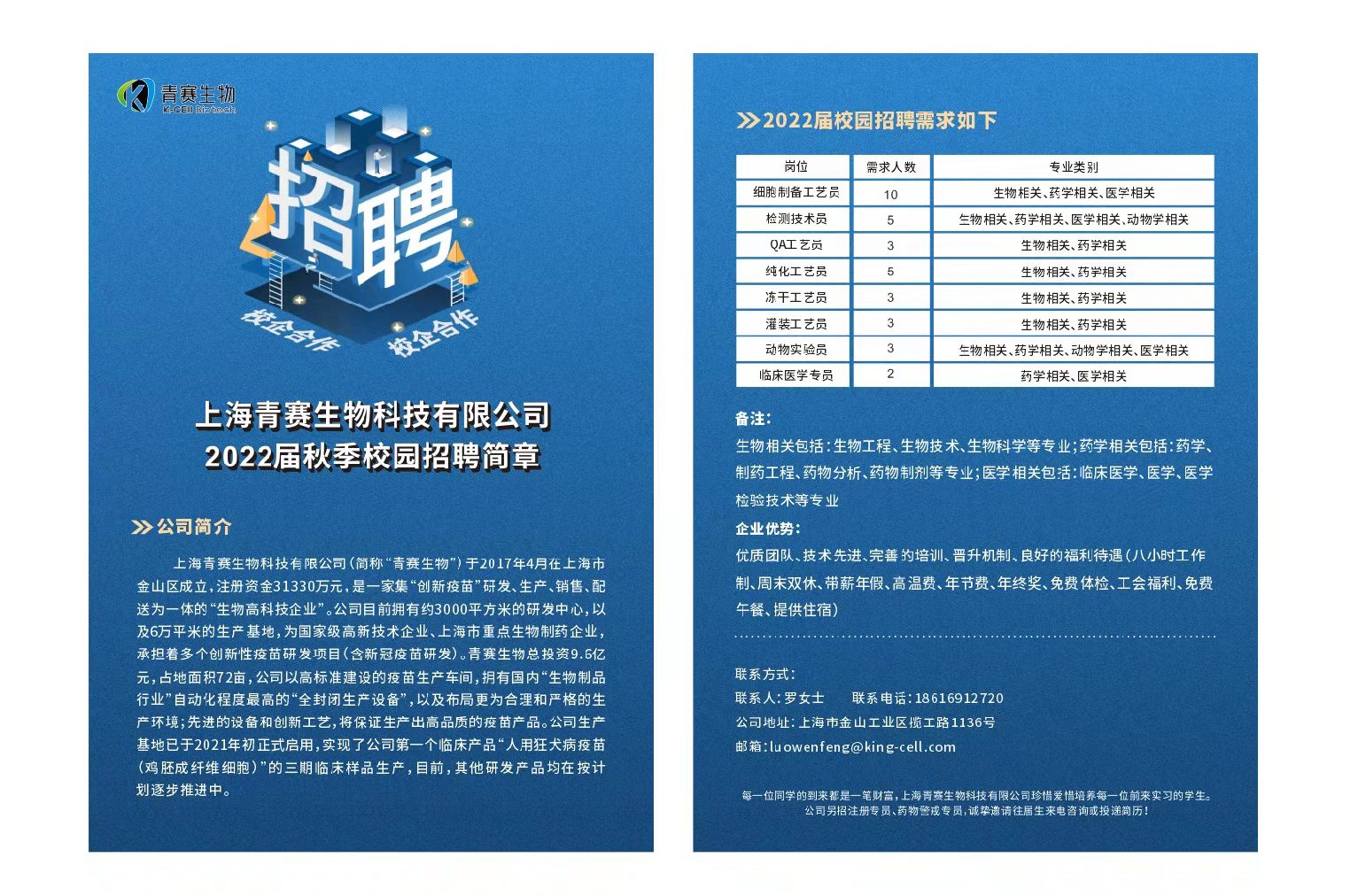 上海青赛生物科技有限公司招聘简章