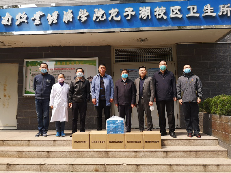 4月9日上午,河南绿之源检测技术有限公司董事长王红岗、总经理张林峰代表公司向公司捐赠的红外额式体温枪100支。董事长罗士喜、社会服务办公室主任胡迎利、英国365集团班子成员和校医院负责人代表公司接受了捐赠。