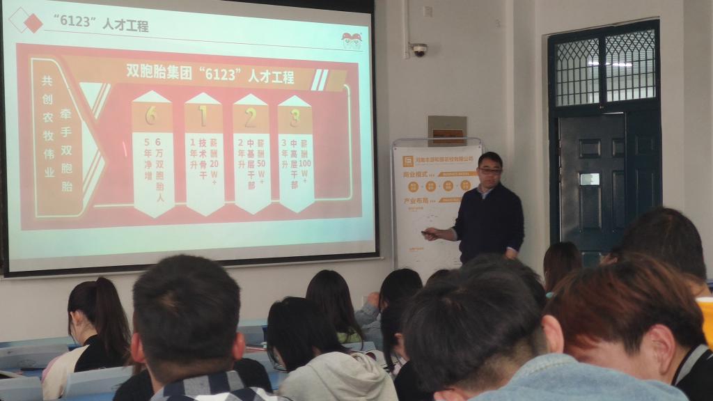 活动伊始,双胞胎(集团)股份有限公司宣讲官北方战区人力资源部长周传银向同学们进行了企业的相关介绍:双胞胎集团成立于1998年,是一家专业从事生猪养殖、养猪服务、饲料销售、玉米收储、生猪屠宰的全国性大型农牧企业。双胞胎掌握核心科技,现拥有专业研发人员400多名,硕博人员100多名,成立院士博士工作站,在荷兰、法国等欧美国家成立研究所,储备了大量的养猪核心技术和饲料核心技术,拥有国家CNAS认证的实验室,国家企业技术中心,两次荣获国家科技进步二等奖,国家专利100多项。双胞胎集团是中国企业500强,中国民营企业500强中国制造业企业500强,农业产业化国家重点龙头企业。未来三年,集团将进一步产业链延伸,大力发展和布局生鲜食品,从田间到餐桌全产业链拉通,进入世界500强企业。通过介绍,让同学们对双胞胎集团有了更深入的了解。接着,周传银部长讲解了本公司此次宣讲会的招聘岗位及相应的职位要求,本次宣讲会一共有11个部门28个岗位,给同学们提供了充分的就业机会。最后,同学们就工作选择和职业发展规划中面临的问题与企业负责人沟通交流,现场气氛热烈。
